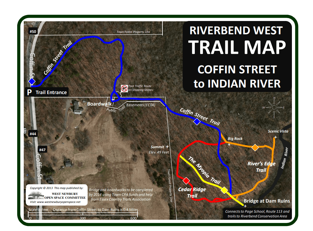 In 2010, a public trail easement was established through development on Coffin Street, providing access from Coffin Street to the Indian River Dam Ruins – a very scenic and historically significant spot at the heart of the forest.